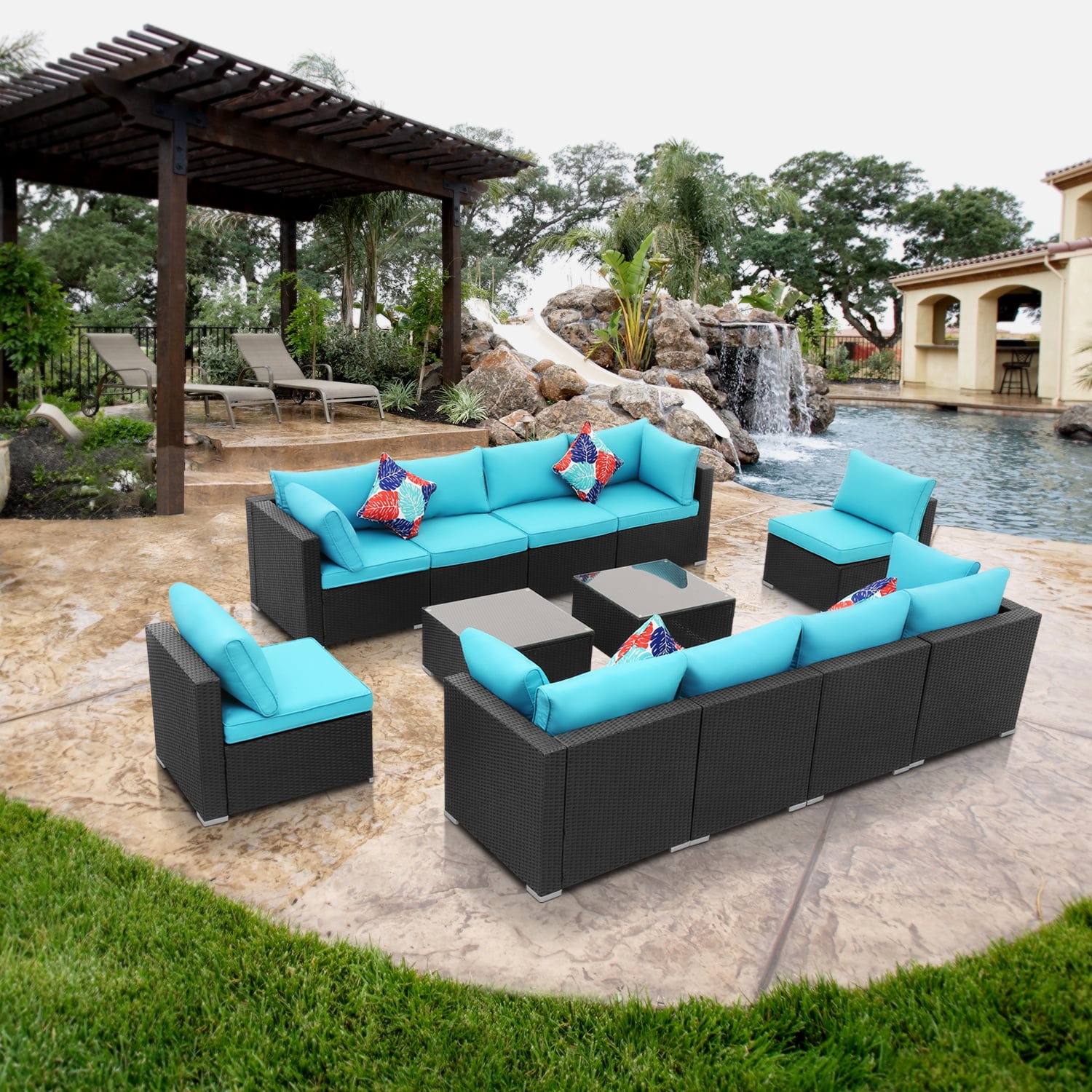 Ainfox 7 Pieces Outdoor Patio Furniture Sofa Set On Clearance All Weather Black Pe Wicker Sectional Lawn Rattan Couch Conversation Chair Set With Blue Thickened Cushions Glass Table Walmart Com